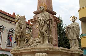 1715, stĺp z r.1803, autori: neznámi sochári, kameň, zlátený kov, brúsené sklo Reštaurovali v r. 1991-92 Ondrej Csütörtöki, akad. soch., prof. Jozef Porubovič, akad. soch., Miroslav Polgár, akad. soch., spolupráca: PhDr. Eva Dénesová