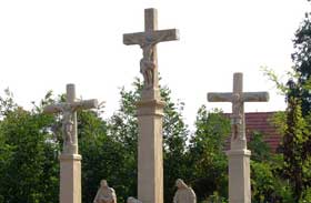 1852., autor: neznámy ľudový sochár, kameň, výška ústredného kríža: 460 cm Reštaurovali v r. 2006-07 Árpád Mézes, akad. soch., Ondrej Csütörtöki, akad. soch., spolupráca: Ing. arch. Peter Hudák, PhD., Martin Kovács