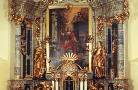 1751, úprava 1893, autori: Jozef Hartmann (sochárska a rezbárska časť), Henrik Sweiser (oltárny obraz a polychrómia), Anton Gratzl (sekundárne dorezávky a reštaurovanie), Július Fuhrmann (sekundárna polychrómia), polychrómovaná drevorezba, olejomaľba na plátne, 800 x 530 cm Reštaurovali v r. 2001 Árpád Mézes, akad. soch., Alexander Koreň, spolupráca: Mgr. Edita Kušnierová, Mgr. art. Peter Koreň